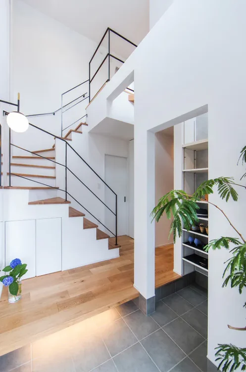 吹き抜けによる開放的なエントランスが印象的な、2階建て住宅の施工事例です。2階へ上がる階段の手すり部分をスケルトン仕様にし、視線の“抜け”を演出しています。