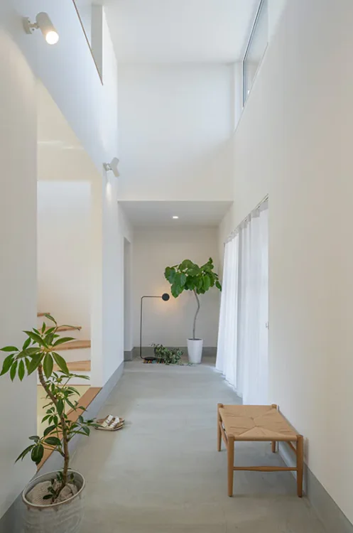 吹き抜けで抜けを演出したエントランスのある家