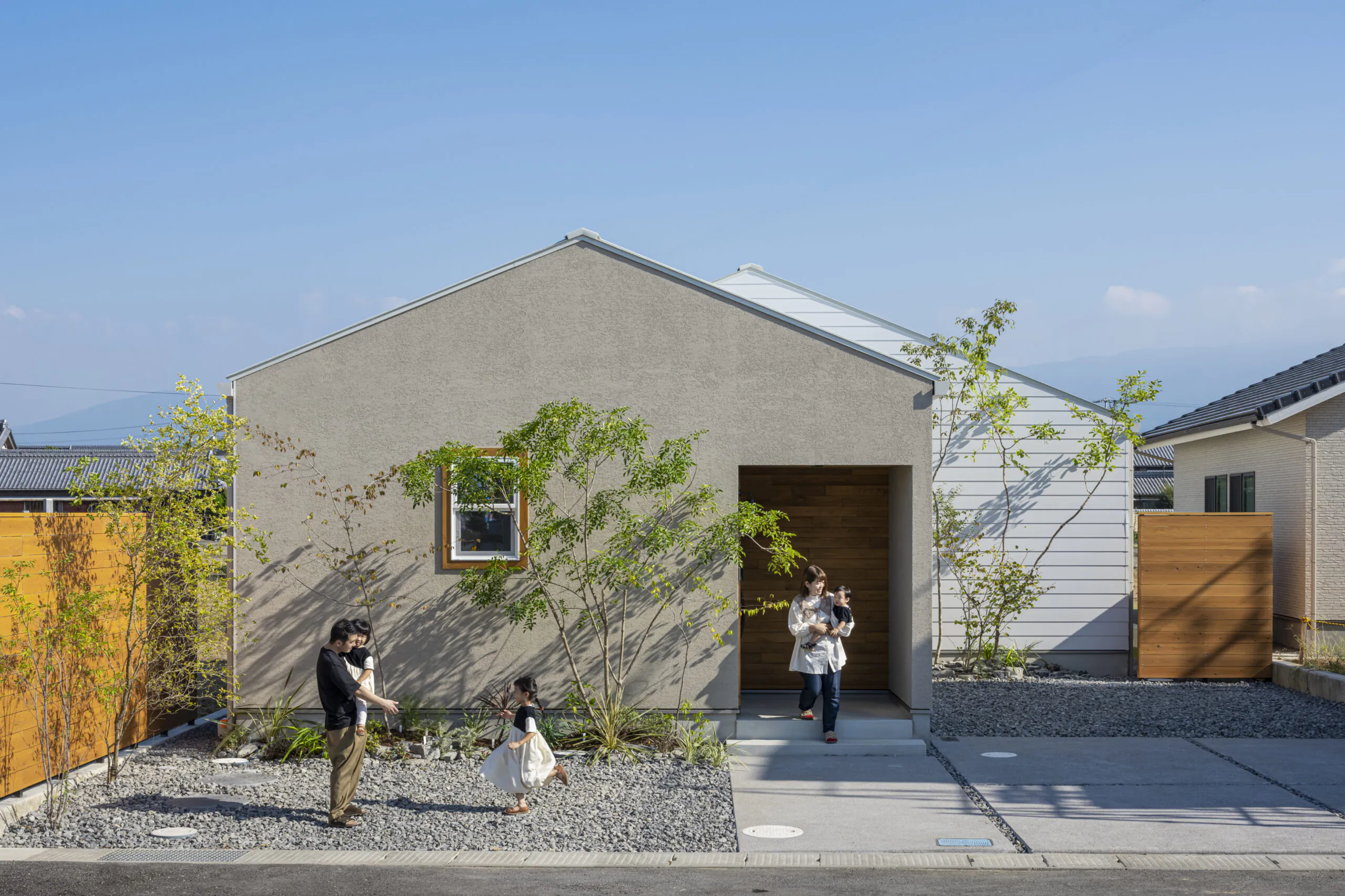 L字型のレイアウトで、暮らしにゆとりとつながりをもたらす平屋の住まい。外壁には落ち着いたグレーベージュの塗り壁を採用し、木の質感を組み合わせることで温もりのある印象に。玄関から続くアプローチは、家族や来客をやさしく迎える穏やかな雰囲気を演出します。中庭を囲むように配置された間取りは、光と風をたっぷり取り込みながら、プライバシーにも配慮した心地よい空間です。