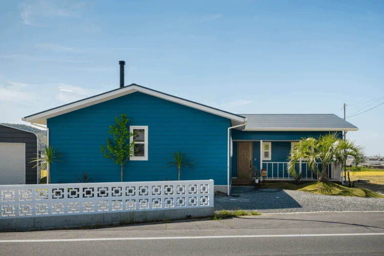 三角屋根にブルーが映えるアメリカンな外観の平屋