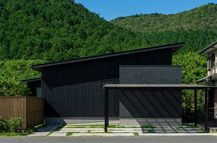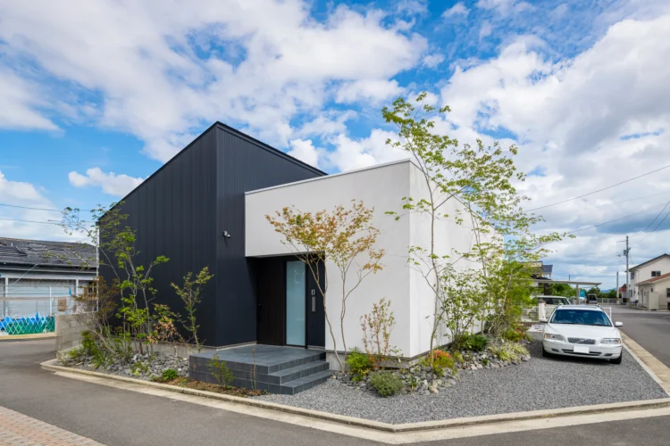 ブラックの塗り壁に焼杉を合わせ和モダンな雰囲気に仕上げた平屋の事例です。焼杉は年月とともに風合いが変わり、その移り変わりも楽しめます。