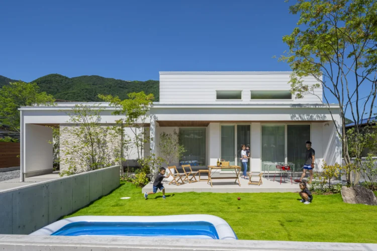 外観も内装も白で統一された、シンプルでありながら目を引く平屋の事例です。センス良く配置された植栽によって、山の風景に溶け込んだおしゃれな外観を実現しています。