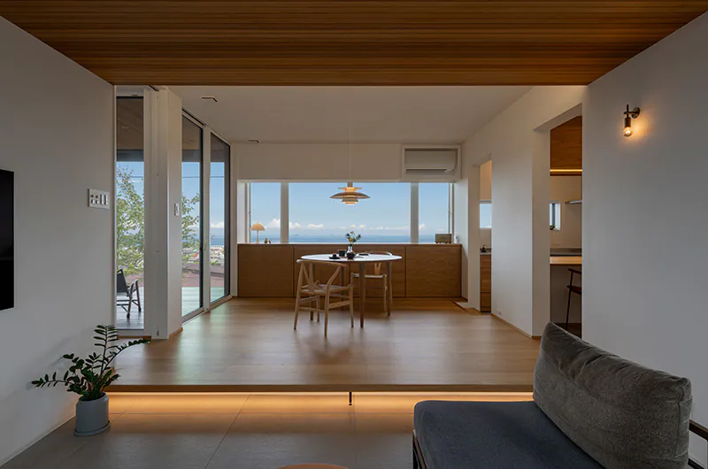 最後に紹介するのは、瀬戸内海の眺望を楽しめる素敵な平屋です。ダイニングの窓の大きさを調整し、立っても座っても景色を眺められるように工夫されています。