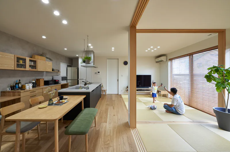 続いて紹介するのは、大きな畳空間のある平屋の施工事例です。LDKと和室がひと続きになっており、建具をつけると個室として利用できます。