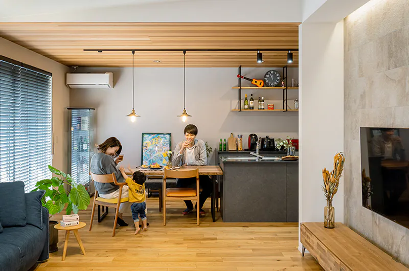 「平屋」「開放感」「薪ストーブ」という希望を取り入れたこちらの住まいは、勾配天井で高さを出し、化粧梁を施したLDKが印象的です。