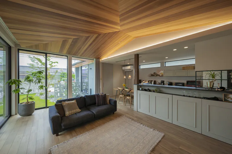 勾配天井は、視界を縦に広げる定番アイデアの一つです。吹き抜けと組み合わせることで、デザイン性のさらなる向上が期待できるでしょう。