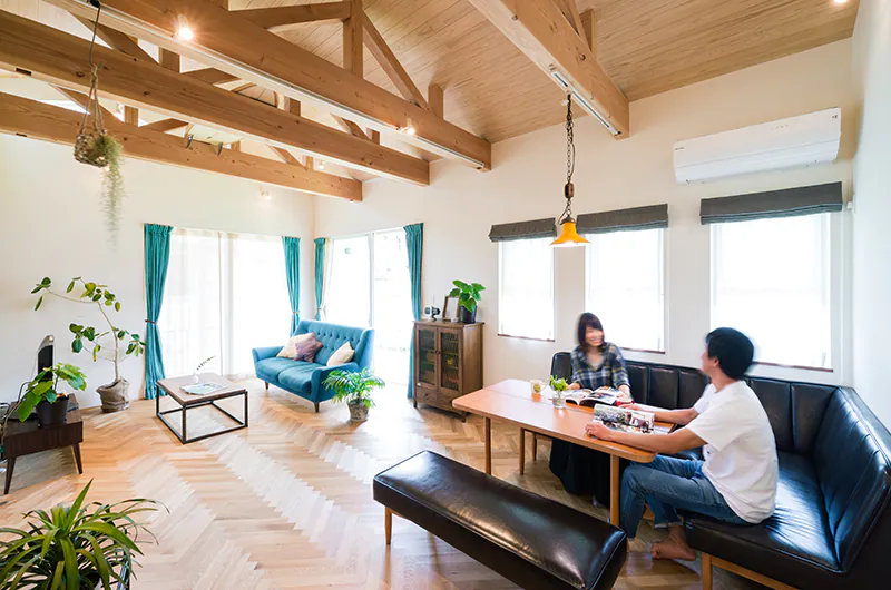 こちらの平屋は、リビングに広がるヘリンボーンの床が印象的です。天井の梁にはサーフボードを収納でき、デザイン性と機能性が備わっています。