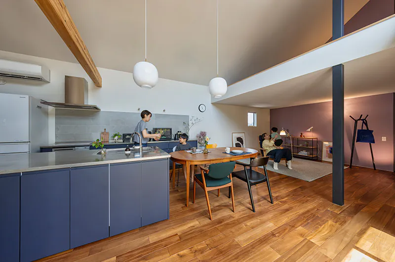 フラットなアイランドキッチンや、背面収納を見せるカフェスタイルが人気です。勾配天井下に設けることで空間に抜け感が生まれます。