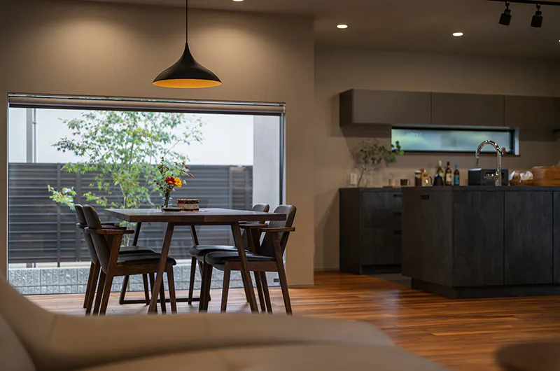 夜になると間接照明が美しい陰影をつくり出し、リビングソファからスケルトン階段越しに美しい中庭を眺められる点も魅力です。