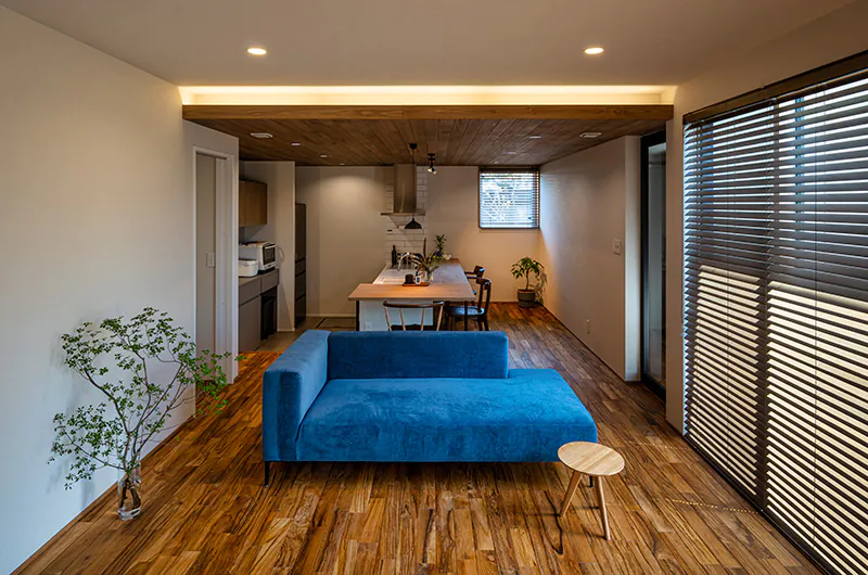 ご家族の希望で木材をふんだんに取り入れた、温かみのある中庭付きの平屋住宅です。外観の軒天や窓枠、床材やリビング天井に至るまで、柔らかな印象の木材を使用しています。
