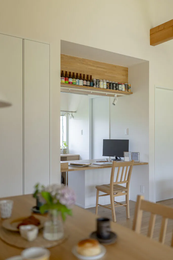 キッチンは1枚の壁でダイニングと区切った設計で、開口部から家族の気配を感じられます。家事室にも同様の設計を取り入れ、集中しやすく落ち着いた空間が完成しています。