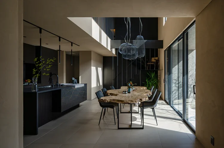 落ち着いたアースカラーでまとめた内装に、漆黒やゴールドのアクセントが映えるホテルライクな空間のおしゃれな間取りの施工事例です。広々としたLDKは、吹き抜けでより開放感を得られる間取りに仕上がっています。