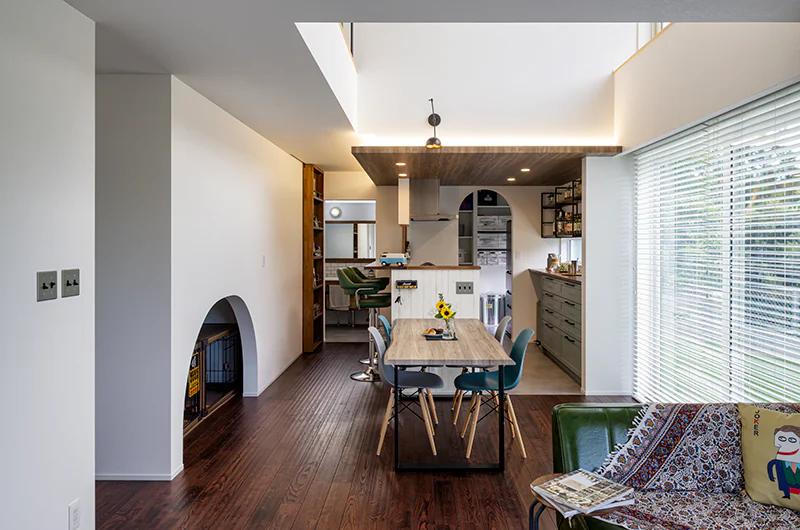 リビングに隣接したアーチ状の土間と、薪ストーブが印象的なおしゃれな間取りの施工事例です。土間部分の広さを確保したことで、薪を置いたり、道具を使ったりするだけでなく、家族がゆったりとくつろげる空間に仕上がっています。
