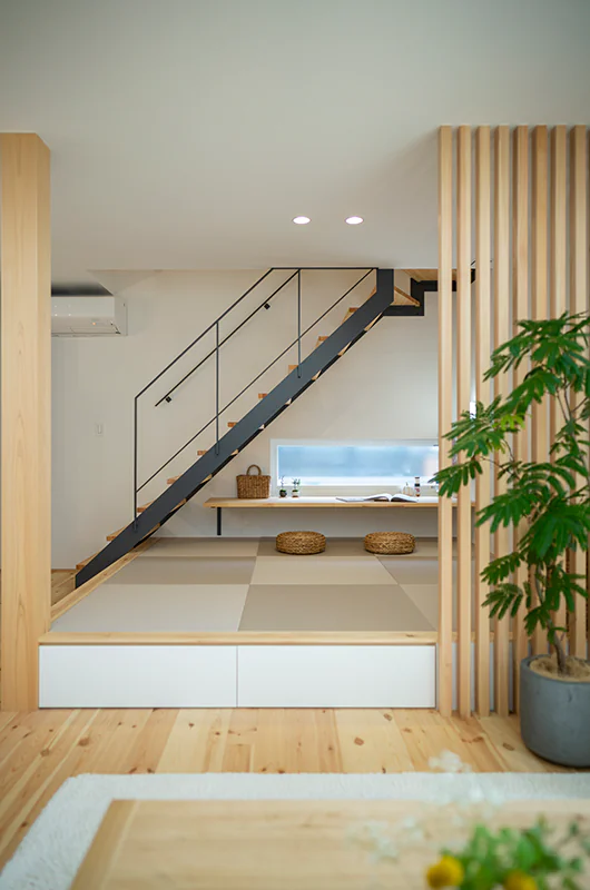 吹き抜けとスキップフロアが魅力的な、おしゃれな間取りの施工事例です。吹き抜けが空間に奥行きを、畳の小上がりが居場所の多様性を生んでいます。