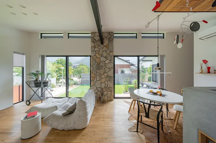 室内はミッドセンチュリー家具が似合う落ち着いた空間に。石張りの壁や梁が、ひと続きのLDKをゆるやかにゾーニングし、勾配天井ならではの開放感を演出します。ダイニングやリビングからは大きな窓越しに庭を望み、内と外が一体となった暮らしを実現しました。