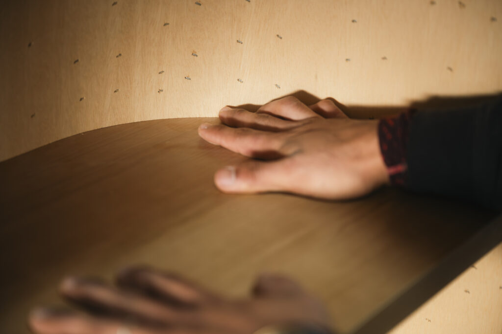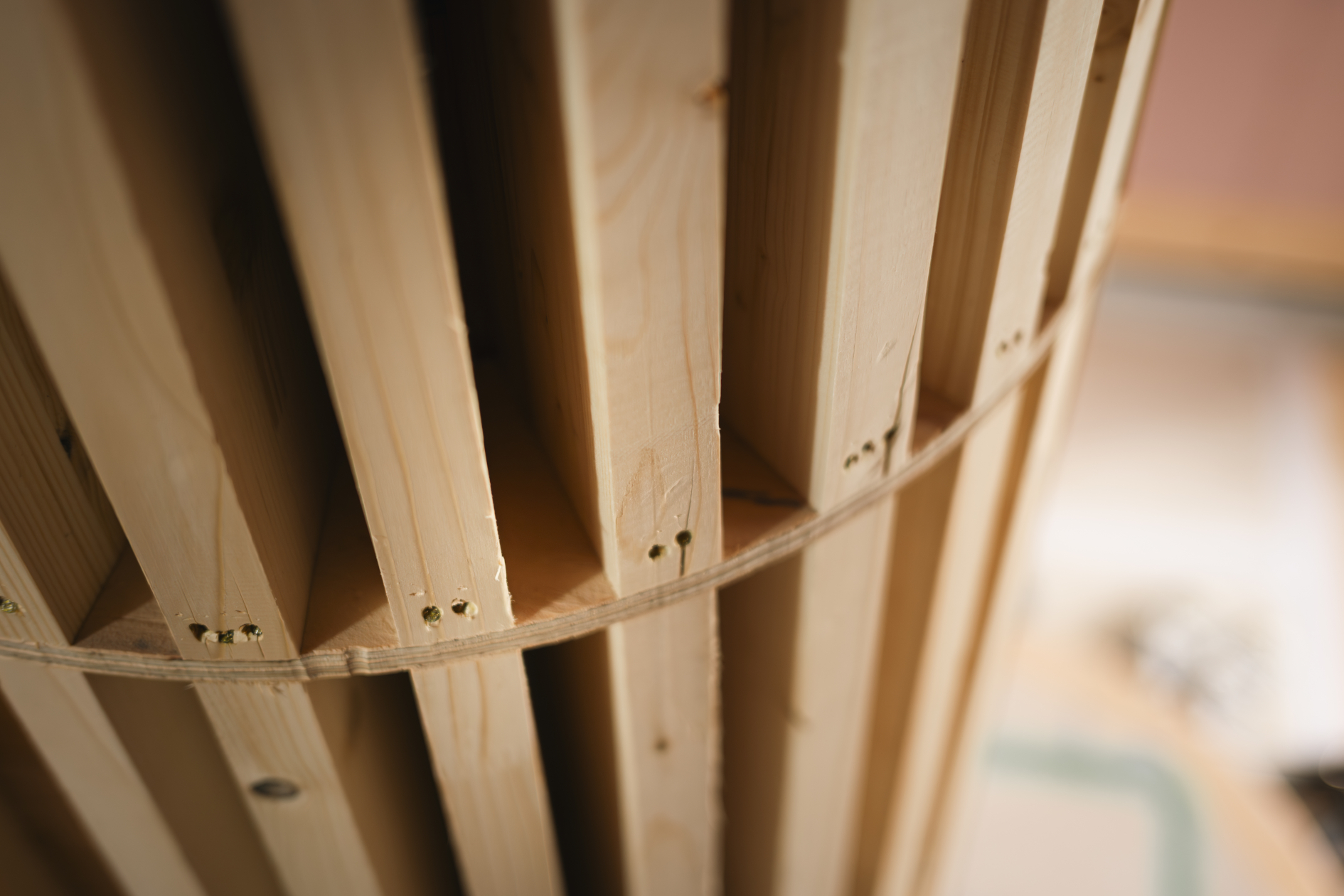 玄関で目を引くアール壁には、壁面を支える柱が一定の間隔できっちりと並びます。この上から専用のボードを湾曲させながら張るので、経年しても美しい曲線が続きます。柱の歪みが起こりにくいように、あえて間に板を挟んで上下2段に分けたそう。