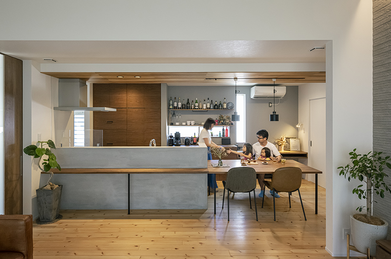 ▲木とモルタルの組み合わせがおしゃれなキッチン。横並びのダイニングテーブルで家事がしやすく◎