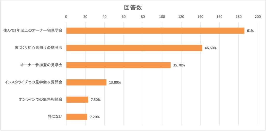 最も多くの支持を集めたのは、「住んで2年以上経ったオーナー宅の見学会」。全体で305件の回答があり、そのうち61%の方が「実際に暮らしている家を見学したかった」と答えられました。