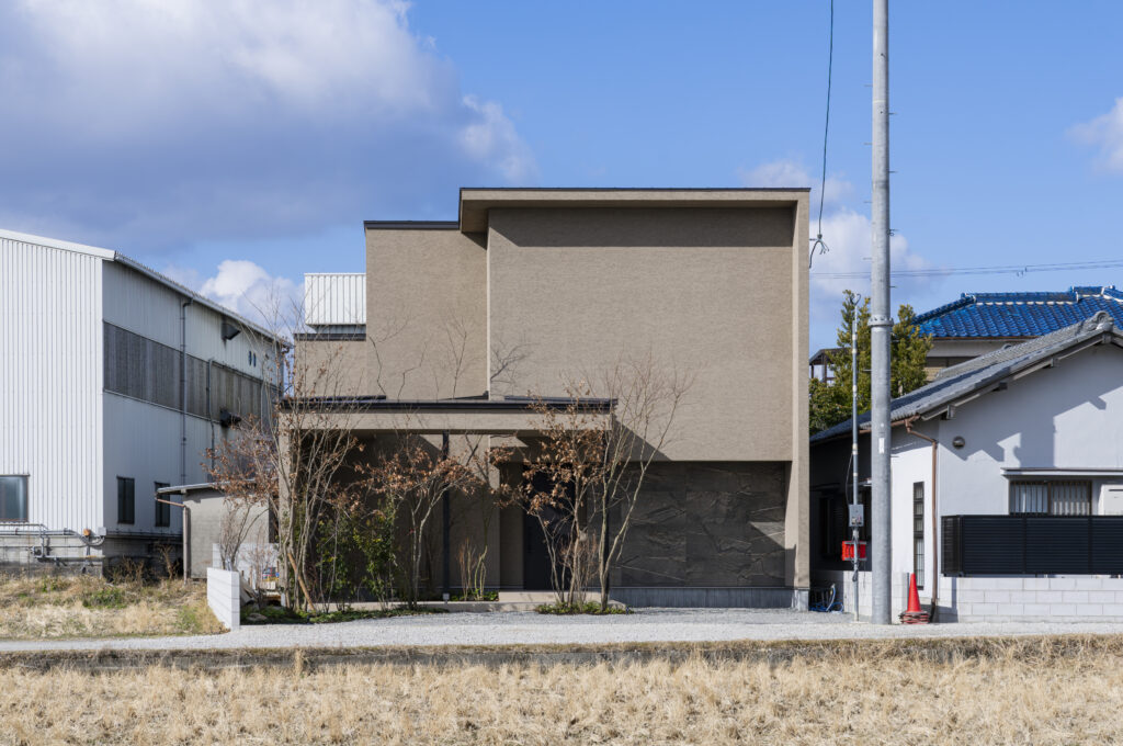この家では、ベースの塗り壁に石調のアクセントを加えることで、重厚感がありながらも温かみのある表情に。さらに前面に植栽を配置することで、四季折々の移ろいが住まいに彩りを加えています。
