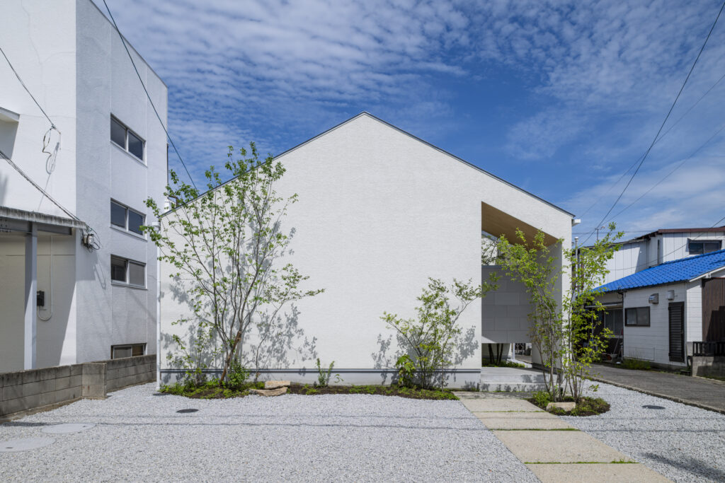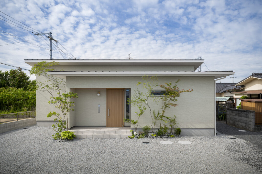 この家は、水平ラインを強調したシルエットがモダンさを、淡いトーンの塗り壁と木目、植栽が和のテイストを演出し、低く抑えたフォルムで街並みにも自然に馴染んでいます。