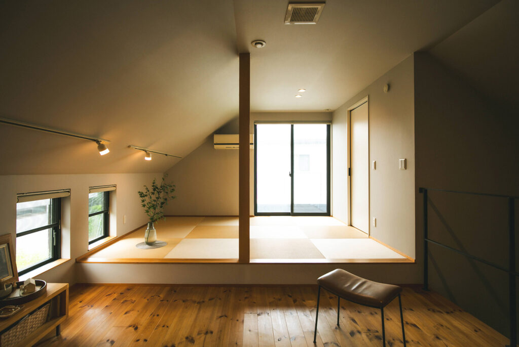 2階はプライベートスペース。テレビのあるセカンドリビング、ご夫婦の寝室として作った小上がりの和室、お子さんの個室があります。経年変化で色つやが深まったパインの無垢床が広がり、三角屋根の勾配を生かした屋根裏部屋のようなおこもり感が心地よい空間です。