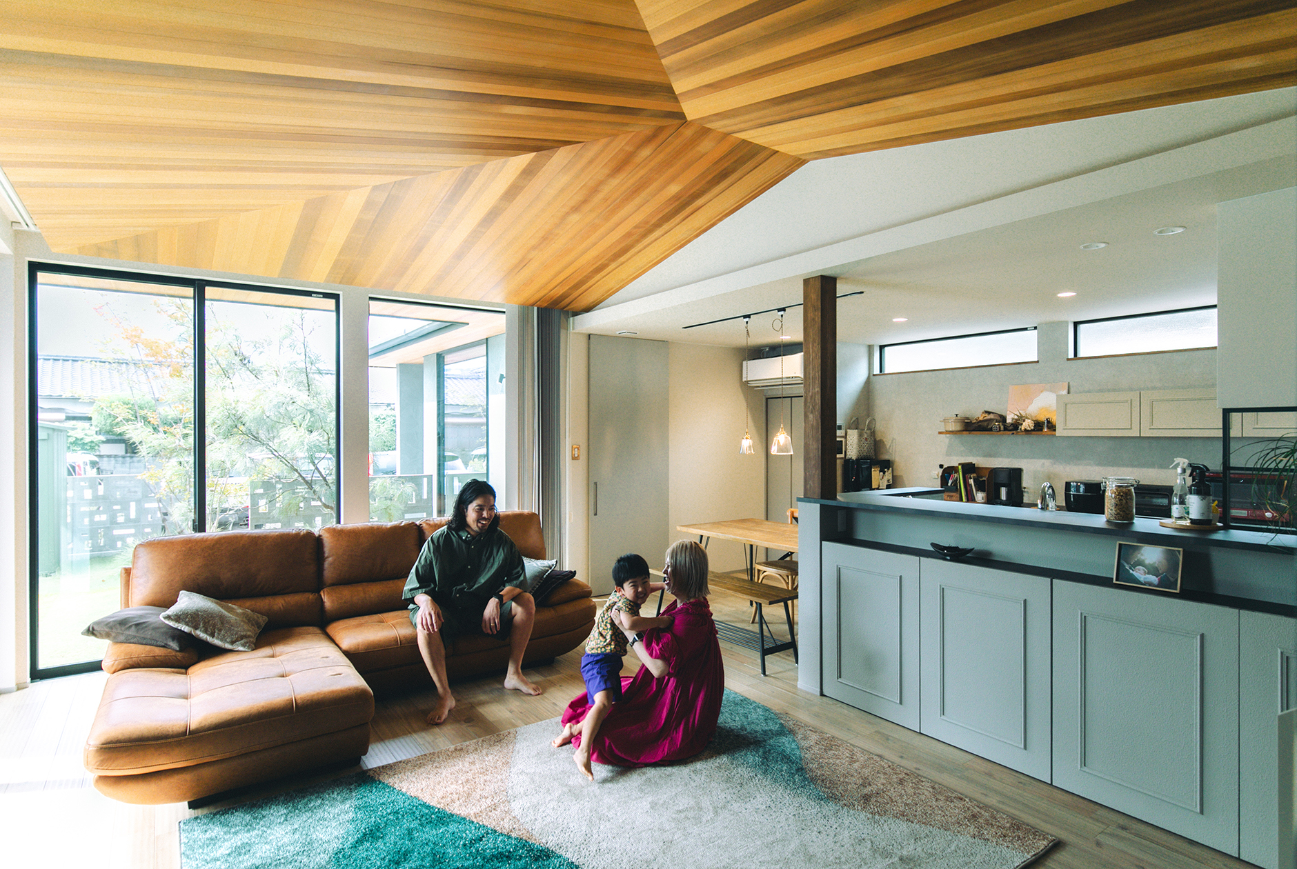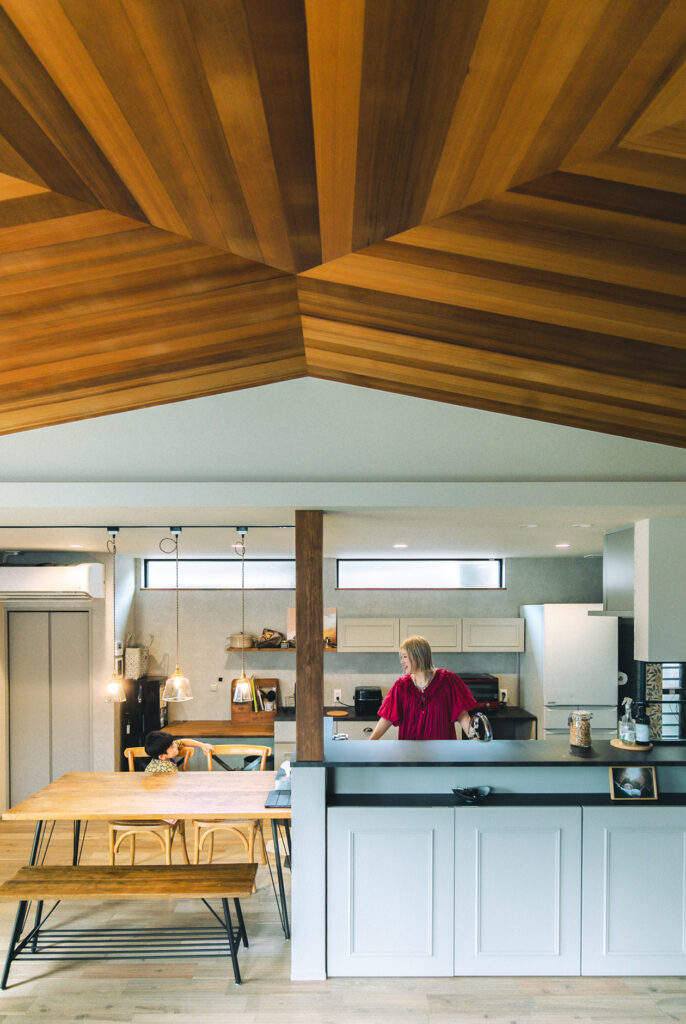 理想の塗り方ができる職人さんを指名して仕上げてもらったツートンカラーの外壁、沖縄から取り寄せた幾何学模様の「花ブロック」、外と内との一体感を感じられる大開口の窓、リビングでひと際目を引く三方向へ広がるレッドシダーの勾配天井、シャビーな色合いで足触りのよいアカシアの床に水回りを彩るヘキサゴンタイル。