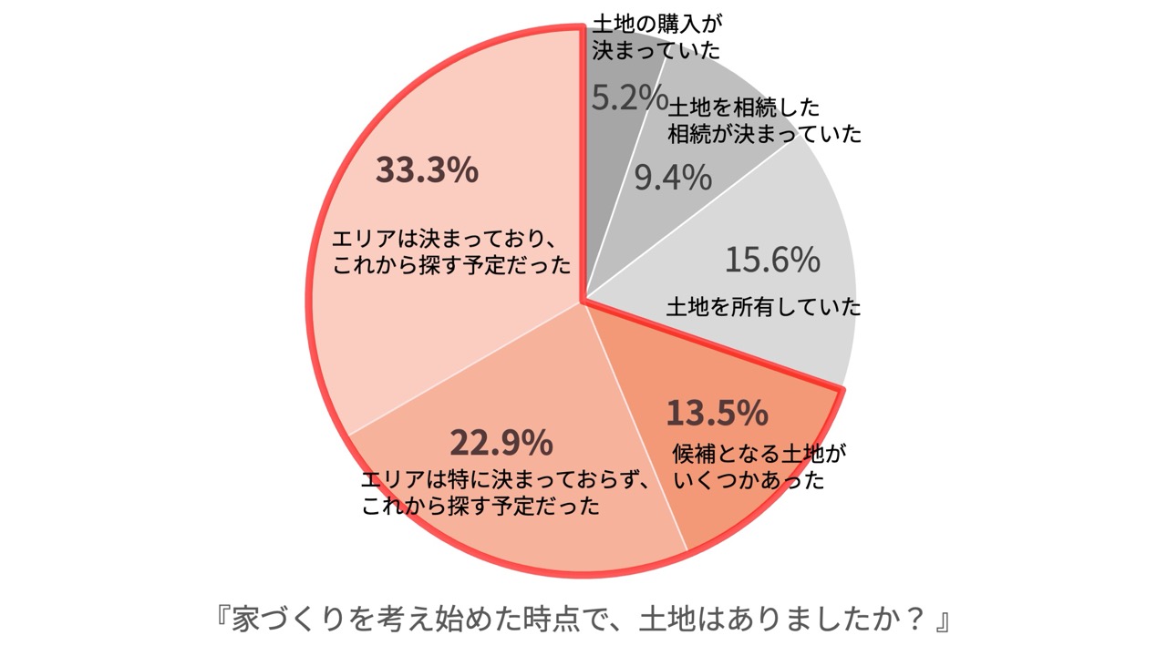 例えば、家づくりにおいて最大のハードルとなる「土地探し」。今回のアンケート対象者96名のうち、相談時点で土地が決まっておらず「土地探しから家づくりを行った」人は、67名(69.7%)に上りました。