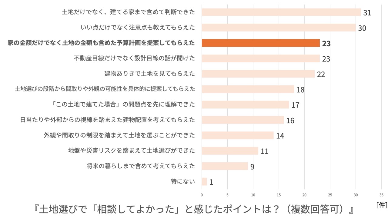 実際に土地探しからスタートした67名に「コラボハウスに土地探しを相談してよかったと感じたポイント」を尋ねたところ、全体の34.3%にあたる23名が「家の金額だけでなく、土地の金額も含めた予算計画を提案してもらえた」ことを挙げています。